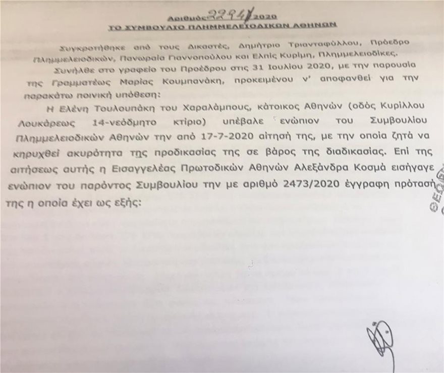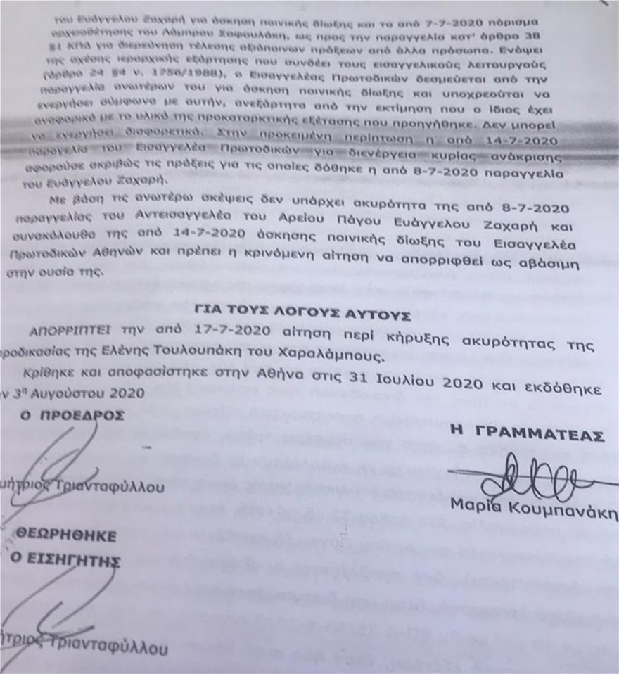 Τρια ΜΜΕ και μαζί τους ένα υπουργός (Αδωνης Γεωργιάδης)δημοσίευσαν στις 30 Ιουλίου 2020 την είδηση ότι το Δικαστικό Συμβούλιο εξέδωσε απόφαση κατά της Εισαγγελέως Διαφθοράς κ.Τουλουπάκη.