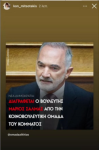 Ο σύντροφος της τενίστριας Σάκαρη αναμιγνυόμενος ευθέως στην πολιτική “προλάλησε” ως καλό “κοκοράκι”τον αποκεφαλισμό του βουλευτή,πρώην Υπουργού Σαλμά.Ιδού: